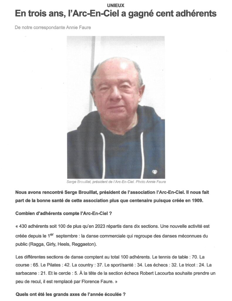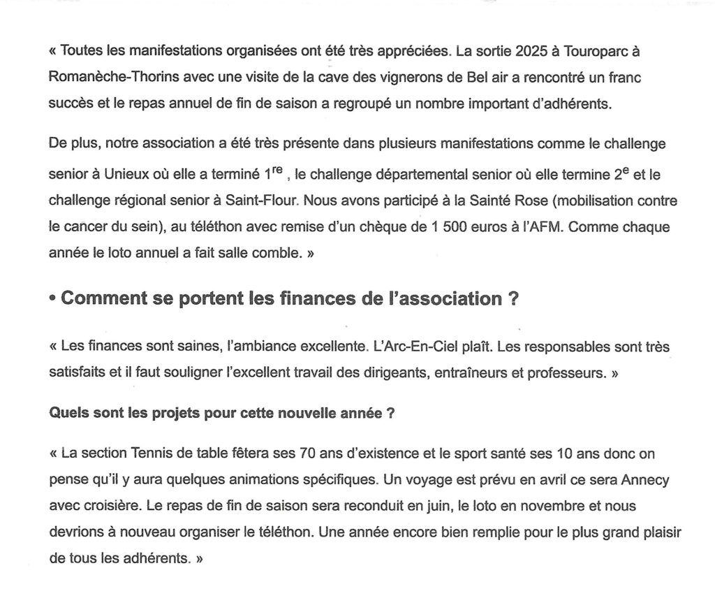 Les adhérents étaient venus en nombre et c’est devant une salle comble que le président Serge Brouillat a ouvert cette AG. 430 adhérents soit 100 de plus qu’en 2023. Une nouvelle activité créée le samedi matin: les danses commerciales qui regroupent des danses méconnues du public (Heels, Ragga, Reggaeton,Girly etc…). Tour à tour, chaque section a présenté son bilan de l’année écoulée. La commission animation a fait le bilan des nombreuses animations de 2025 et présenté celles arrêtées pour cette année: voyage Annecy, repas de fin de saison, loto, 70 ans de la section tennis de table, téléthon…